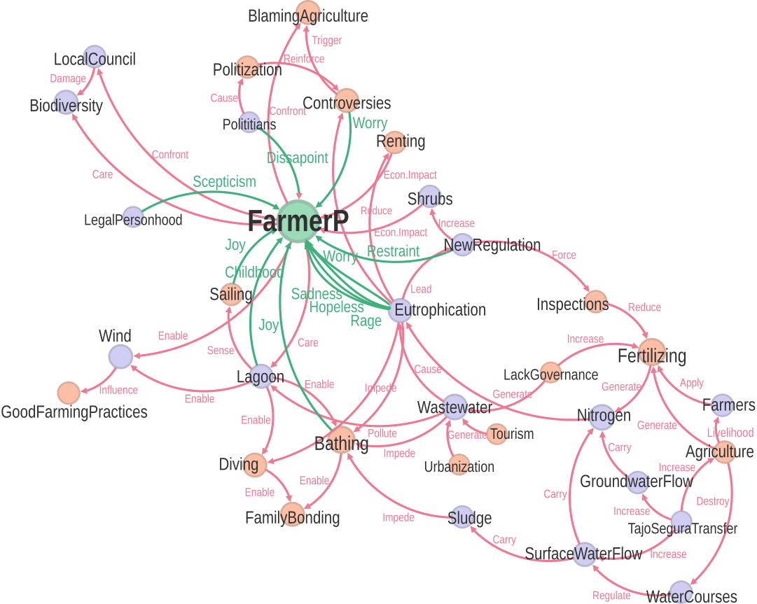 We used network analysis to visualize these “SEAAs,” showing how, for instance, childhood memories of swimming are inextricably entangled with nitrogen molecules and agricultural runoff in the eutrophicated Mar Menor; or how the lagoon’s green waters directly modulate the mood and agency of those living on its shores; or how facts and emotions align: Participants with similar emotional attachments to the territory often share similar views on why the crisis is happening.