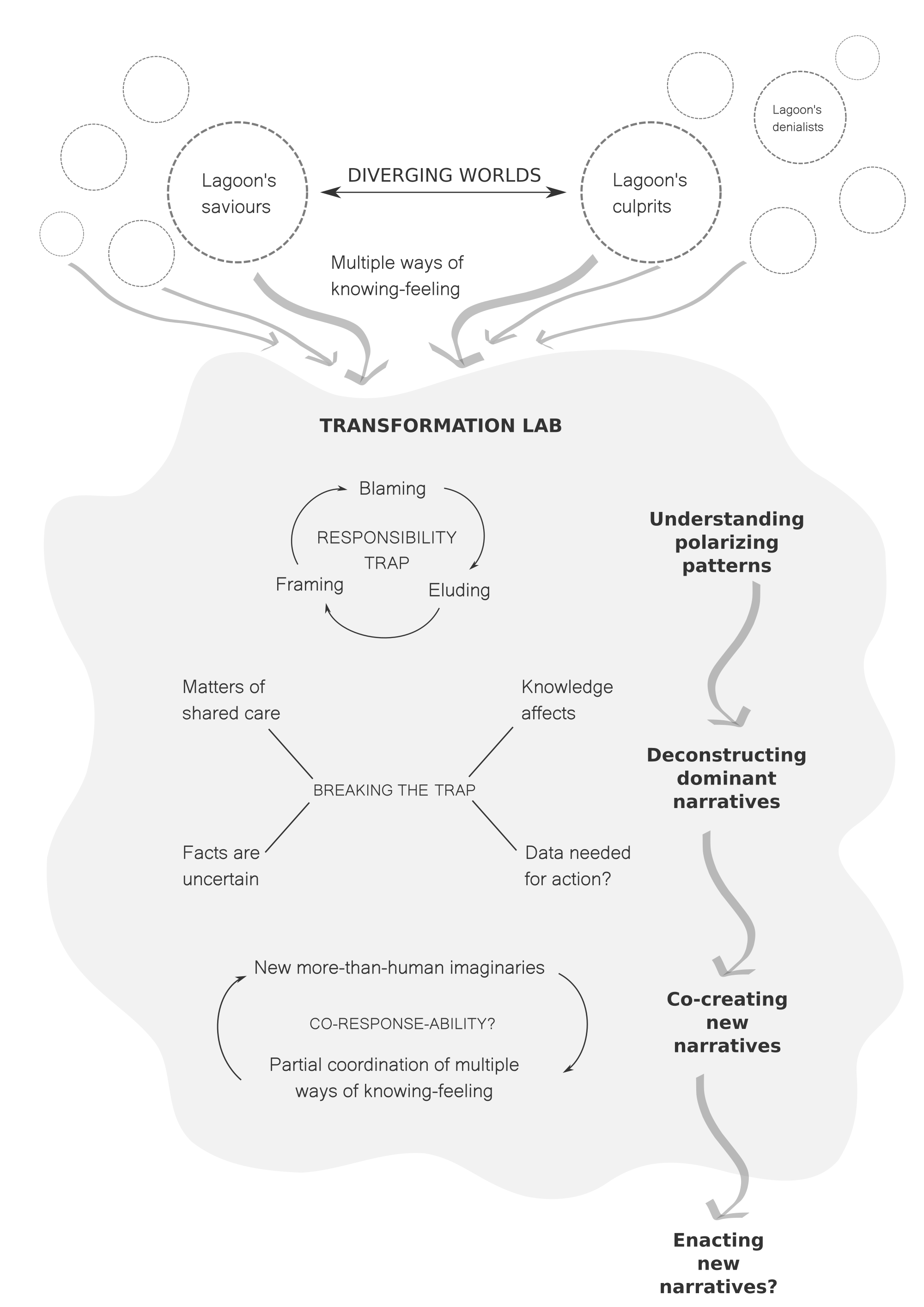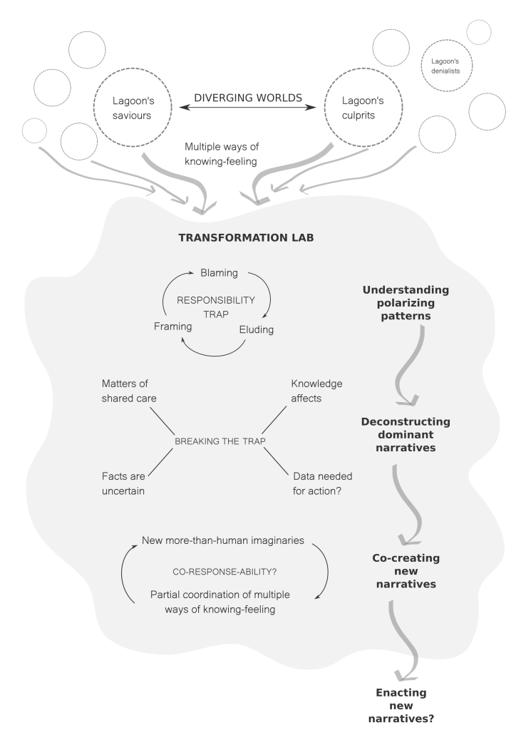 The diffractive analysis helped me understand how the polarizing pattern was expressed within the group of participants as cycles of framing, blaming and eluding rensponsibility, a responsibility trap. How then to move from responsibilty as a trap to response-ability as a relational quality, as suggested by Donna Haraway? I identify those moments in which the trap was challenged or shifted to a different co-response-able pattern by recognizing the lagoon as a shared matter of care, foregrounding how knowledge affects, embodying polarized narratives, exposing uncertainties in contested facts, and demonstrating that action can be taken even under uncertain conditions.