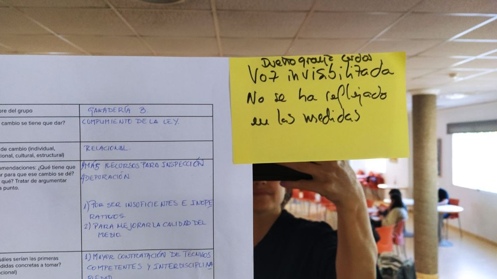Las personas participantes del curso representaron muy bien sus roles, se metieron en su piel, incluso en aquellos que representaban visiones muy distintas a la suya propia. Y ocurrió lo que esperábamos: surgieron las diferencias, el conflicto. Unos grupos llegaron a producir recomendaciones, otros no. Lo importante en realidad era la dinámica grupal para poder reflexionar sobre las oportunidades y retos de este formato de deliberación ciudadana en contextos de alta contestación social como el Mar Menor. Por la tarde hicimos un análisis colectivo de lo que había pasado y salieron temas muy potentes que tendremos que analizar con calma (viene un libro sobre este curso!). Algún apunte que tomé:
