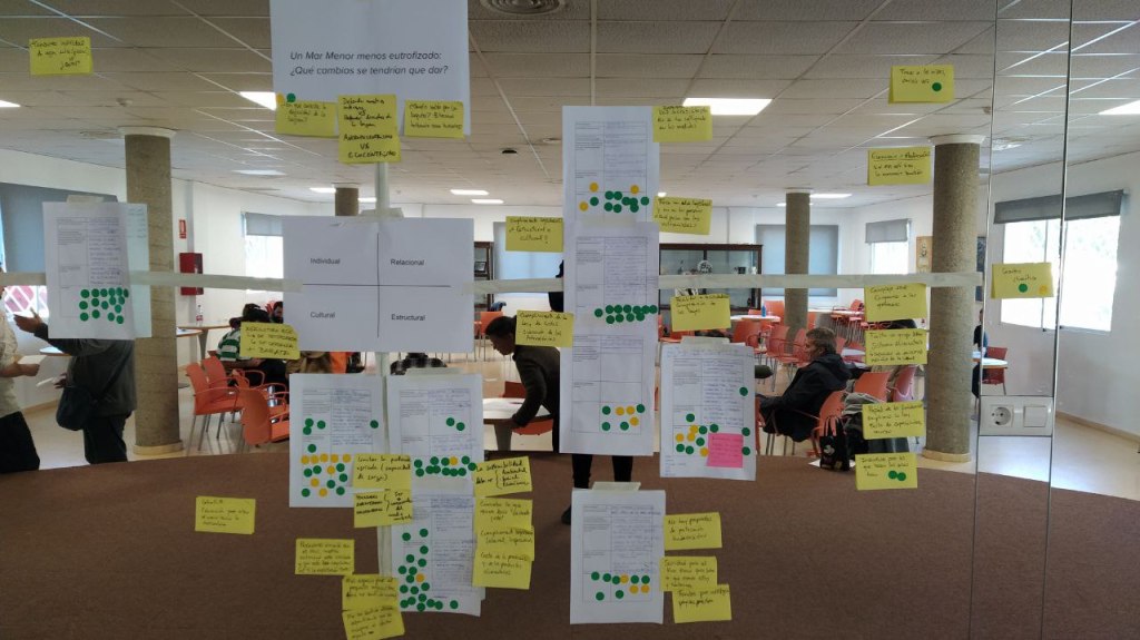 Lo hicimos por temas que se relacionan con la eutrofización de la laguna: la agricultura, la producción animal, el urbanismo y las aguas residuales, las inundaciones y la conservación de la biodiversidad lagunar. Usamos un marco de teoría del cambio por el cual las recomendaciones de cambios podían ser estructurales, culturales, relacionales o individuales ¿Adivináis hacia donde fueron las recomendaciones? La mayoría se centraron en cambios estructurales relacionados con el cumplimiento de la legislación vigente y con el cambio de modelo agrario y territorial. Algunas de ellas tocaban aspectos culturales y relacionales. Tan sólo una fue dirigida a cambios individuales. Interesante ¿No?